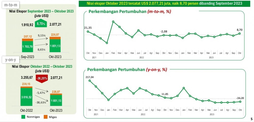 GARISPENA.CO - SAMARINDA - Nilai ekspor Kaltim terus mengalami peningkatan. Pada Oktober, produktivitas Bumi Etam berada di angka USD 2.077,21 juta, atau naik 8,70 persen dari bulan sebelumnya. Dari sektor migas, pada Oktober 2023 tercatat USD 226,07 juta, atau naik 9,15 persen. Sementara itu, ekspor nonmigas tercatat USD 1.851,13 juta, atau naik sebesar 8,65 persen.