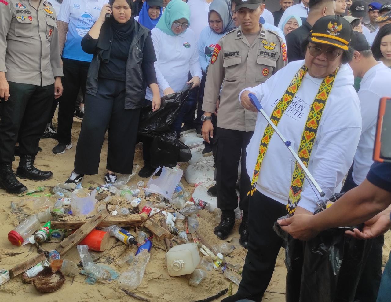 Bersama sejumlah pejabat, komunitas, pegiat lingkungan, serta BUMN, Siti Nurbaya menyisiri kawasan Pantai Banua Patra Balikpapan untuk memungut sampah, terutama sampah plastik.
