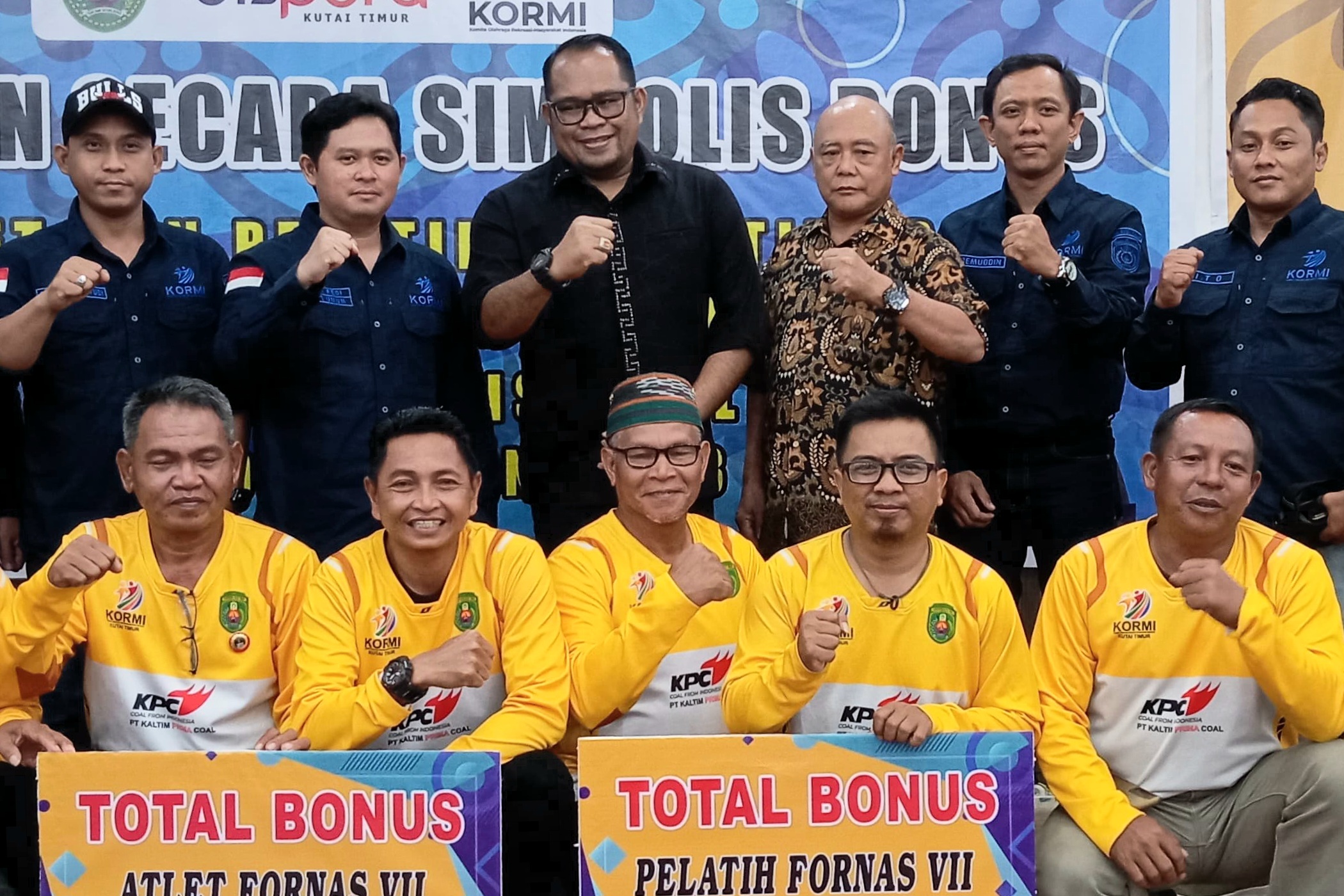 GARISPENA.CO - SANGATTA - Atlet dan pelatih Kutim yang meraih medali pada Festival Olahraga Masyarakat Nasional (Fornas) VII di Jawa Barat (Jabar) 2023 lalu, akhirnya menerima bonus dari Pemerintah Kabupaten Kutai Timur (Pemkab Kutim) melalui Dinas Pemuda dan Olahraga (Dispora). Penyerahannya dilaksanakan di Hotel Victoria, Sangatta, Kutai Timur (Kutim), Selasa (28/11/2023) malam.