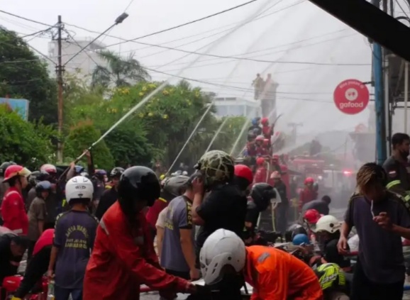 Puluhan personel pemadam pun dibuatnya sibuk sebab kondisi bangunan yang begitu rapat alias tanpa celah ditambah material bangunan permanen membuat kesulitan petugas semakin bertambah.