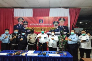 BERSINERGI : M Ilham Agung Setyawan (tiga kiri) dan Jumadi (tengah) saat memberikan salam semangat pemasyarakatan usai menggelar jumpa pers.