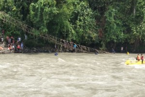GARISPENA.CO - Timika - mpat personel TNI Polri terbawa arus sungai Digoel saat melintas di tengah jembatan. Mereka terjatuh dari karena tali jembatan gantung yang dilewati putus seketika.