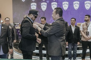 FOTO : Ketua IMI Bambang Soesatyo Pusat (kanan) memasang pin menandakan Ketua IMI Kaltim resmi dikukuhkan.